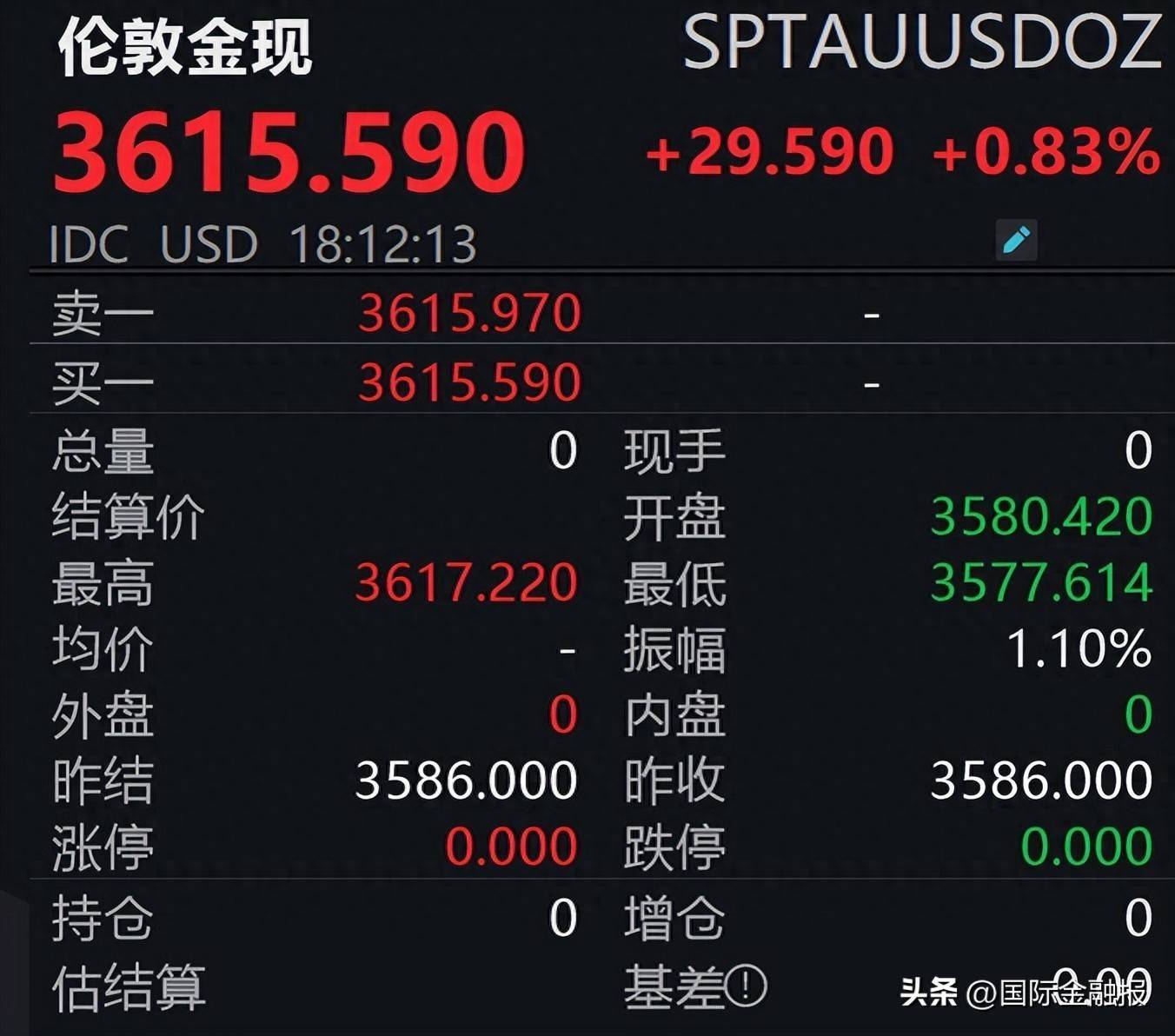 9月8日,国际金价直线拉涨。截至记者发稿,伦敦金现上涨0.83%,报3615.59美元/盎司,盘中最高触及3617.22美元/盎司,再创历史新高。