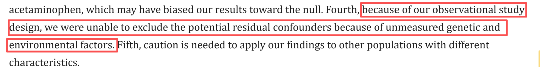 波士顿出生队列研究为例,作者在研究局限性的第四条里也写得很明白了:由于本研究采用观察性研究设计(注:属于相关性研究),我们无法排除因未测量的遗传与环境因素所导致的潜在残余混杂因素。