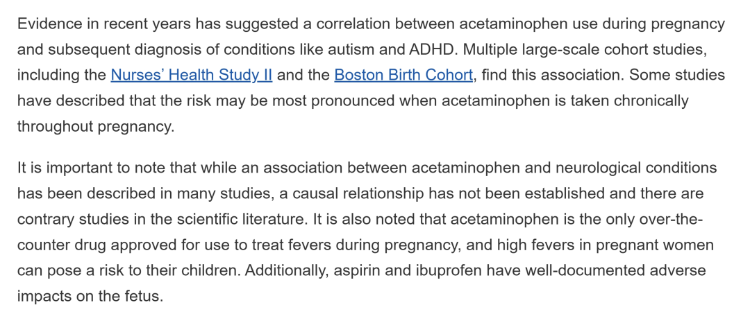 “近年来的证据表明,孕期服用对乙酰氨基酚与随后诊断出的自闭症和多动症等疾病之间存在相关性。多项大规模队列研究,包括护士健康研究 II波士顿出生队列研究,都发现了这种相关性。一些研究表明,在整个孕期长期服用对乙酰氨基酚的风险可能最为显著。