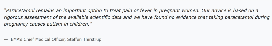 欧洲药品管理局(EMA)也在官网上发文,重申欧盟内孕期使用对乙酰氨基酚的推荐 “不变”。 EMA首席医疗官斯特芬·蒂尔斯特鲁普说: