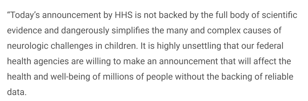 卫生与公众服务部今天的声明缺乏充分的科学证据支持,并且危险地简化了儿童神经系统疾病的诸多复杂病因。我们的联邦卫生机构竟然愿意在没有可靠数据支持的情况下发布一项将影响数百万人健康和福祉的声明,这令人极为不安。“