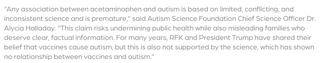 医学界的相关驳斥声明还有很多,我不再一一列举。单从我列举的几个声明,你能看到医学界的共识:特朗普声称的“孕期吃对乙酰氨基酚导致孩子自闭症“,科学证据不足。