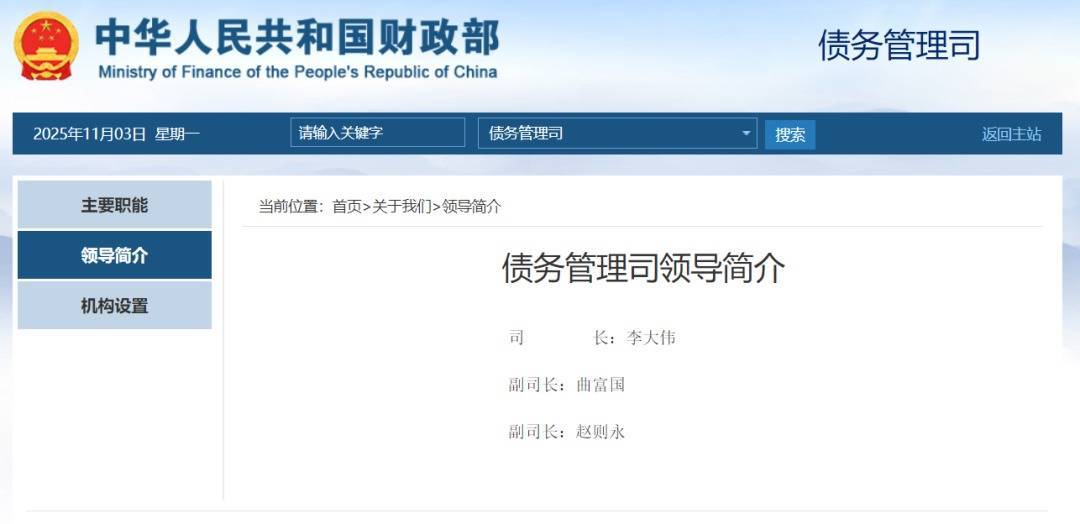 财政部债务管理司领导包括:司长李大伟涵乔财富,副司长曲富国、赵则永。