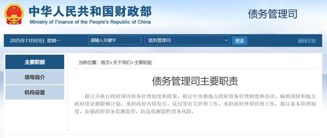 近日涵乔财富,财政部官网“机构设置”栏目更新信息显示,财政部债务管理司已列入“部机关”列表。
