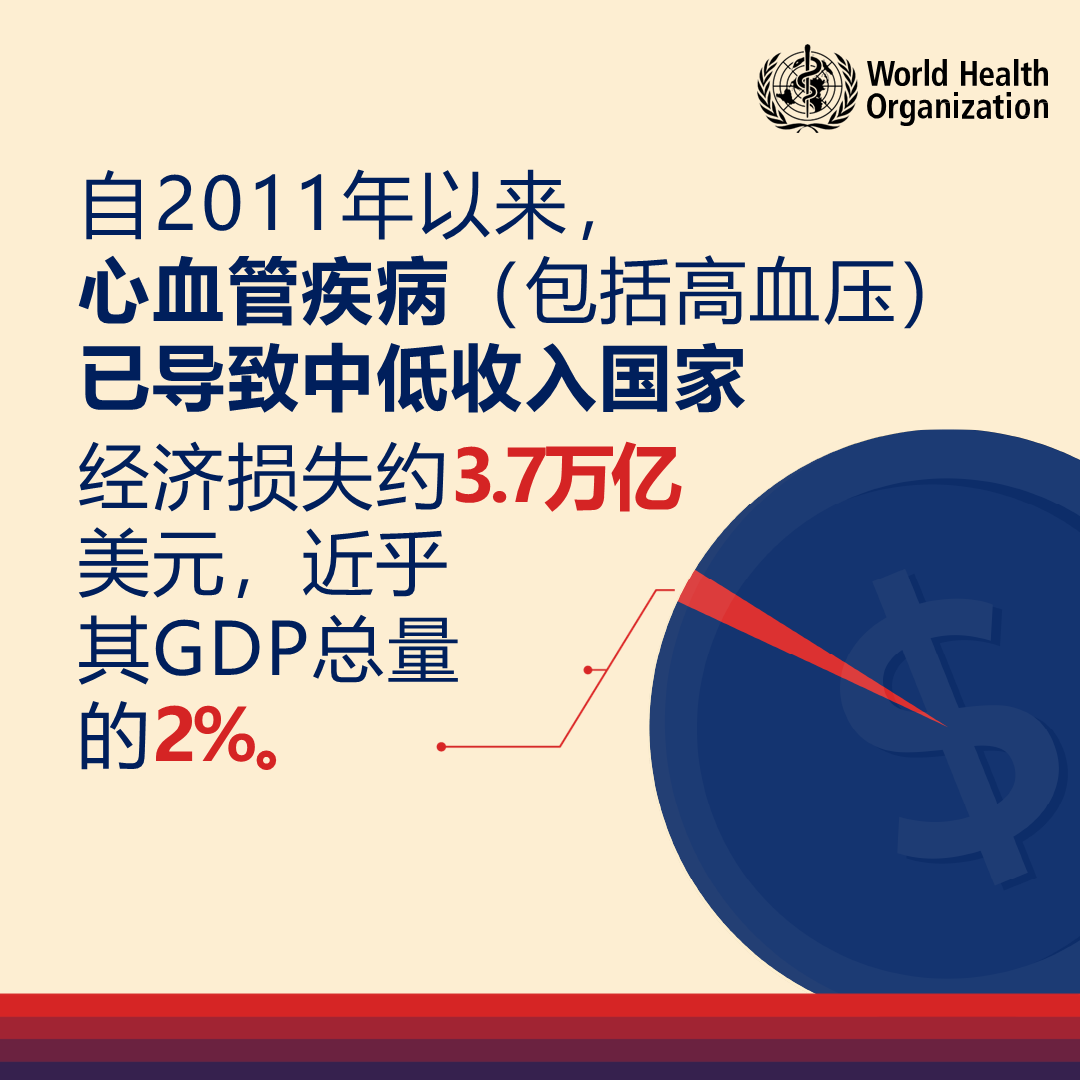 高血压是心脏病、脑卒中、慢性肾病和痴呆症的主要诱因。这一可防可治的疾病若得不到及时的应对,将继续导致数百万人过早死亡,并使各国面临持续的经济损失。2011至2025年间,包括高血压在内的疾病预计将给中低收入国家造成3.7万亿美元损失。